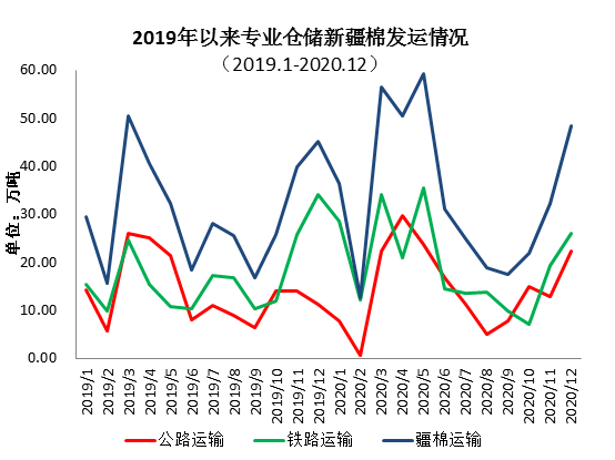 12月,新疆棉花專業倉儲庫出疆發運量為48.31萬噸,環比增加16.15萬噸,高于去年同期3.08萬噸。